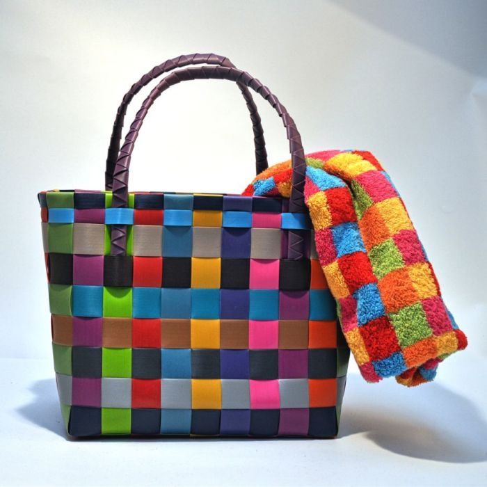 Vrolijke stevige tas van gerecycled plastic.